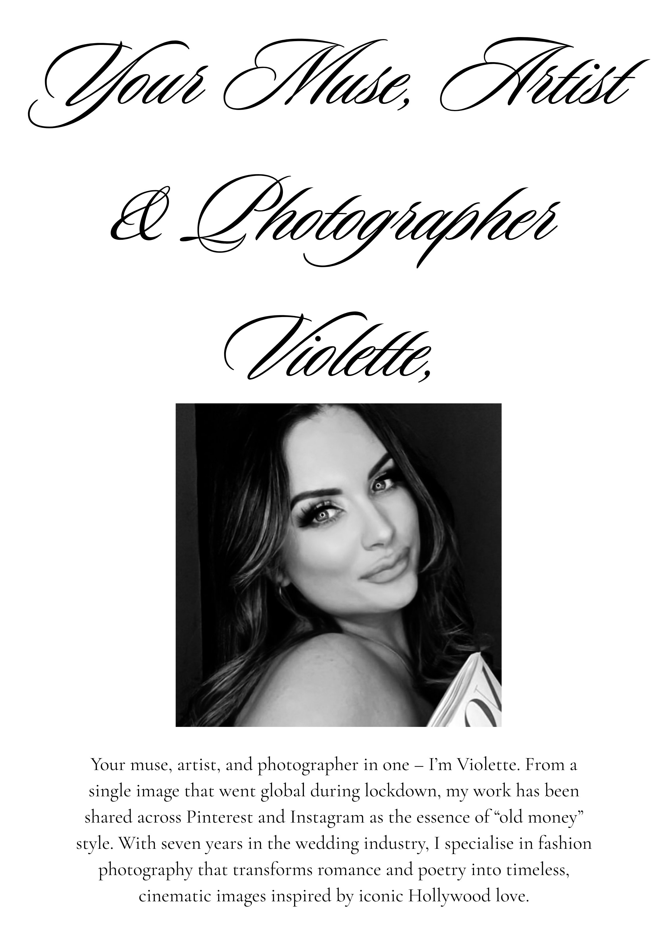 “London, Hertfordshire, Surrey & Worldwide, Violette has been a fashion, fine art, and wedding photographer for almost a decade. She brings a touch of luxury and uniqueness to every shoot.”
