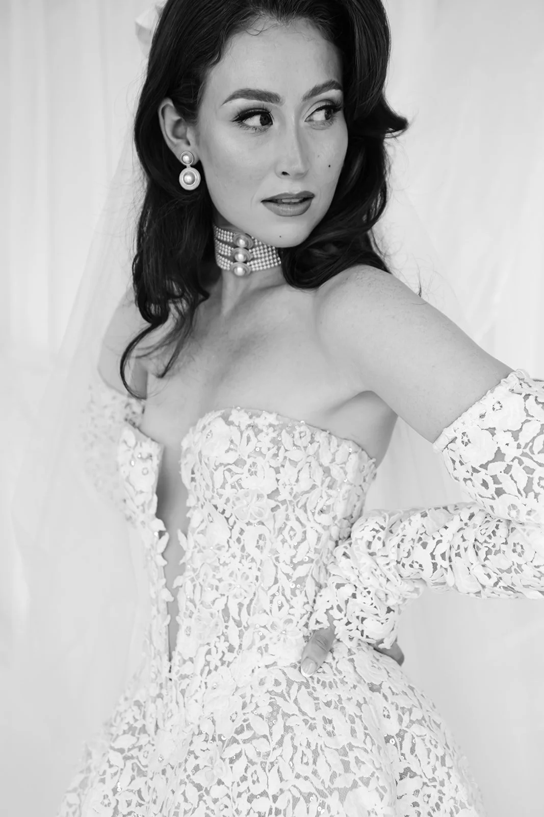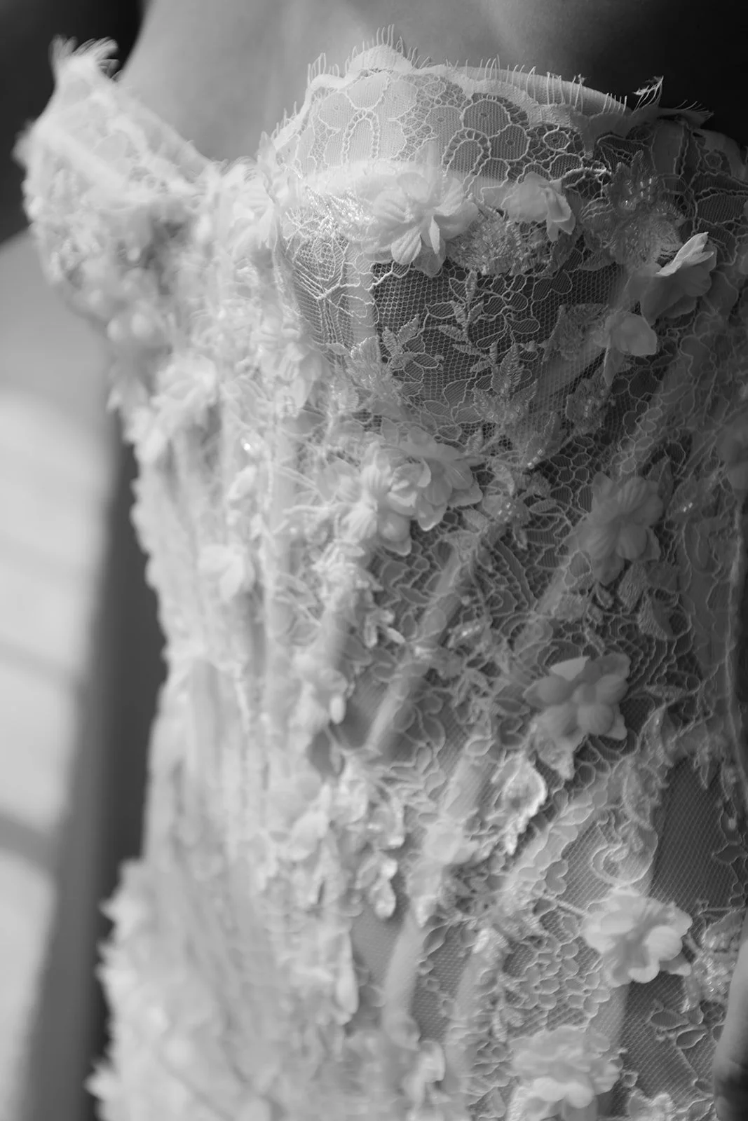This shoot centred on Berta — a house synonymous with sensual elegance and uncompromising craftsmanship. To me, a Berta gown is not just couture, it is architecture in motion: sculpted silhouettes, delicate lacework, intricate beading, and fabrics that seem to ripple like light itself. One of the gowns we photographed was from Berta’s newest collection, and the artistry in its construction spoke volumes of the brand’s evolution — timeless yet forward-thinking, romantic yet fiercely modern.